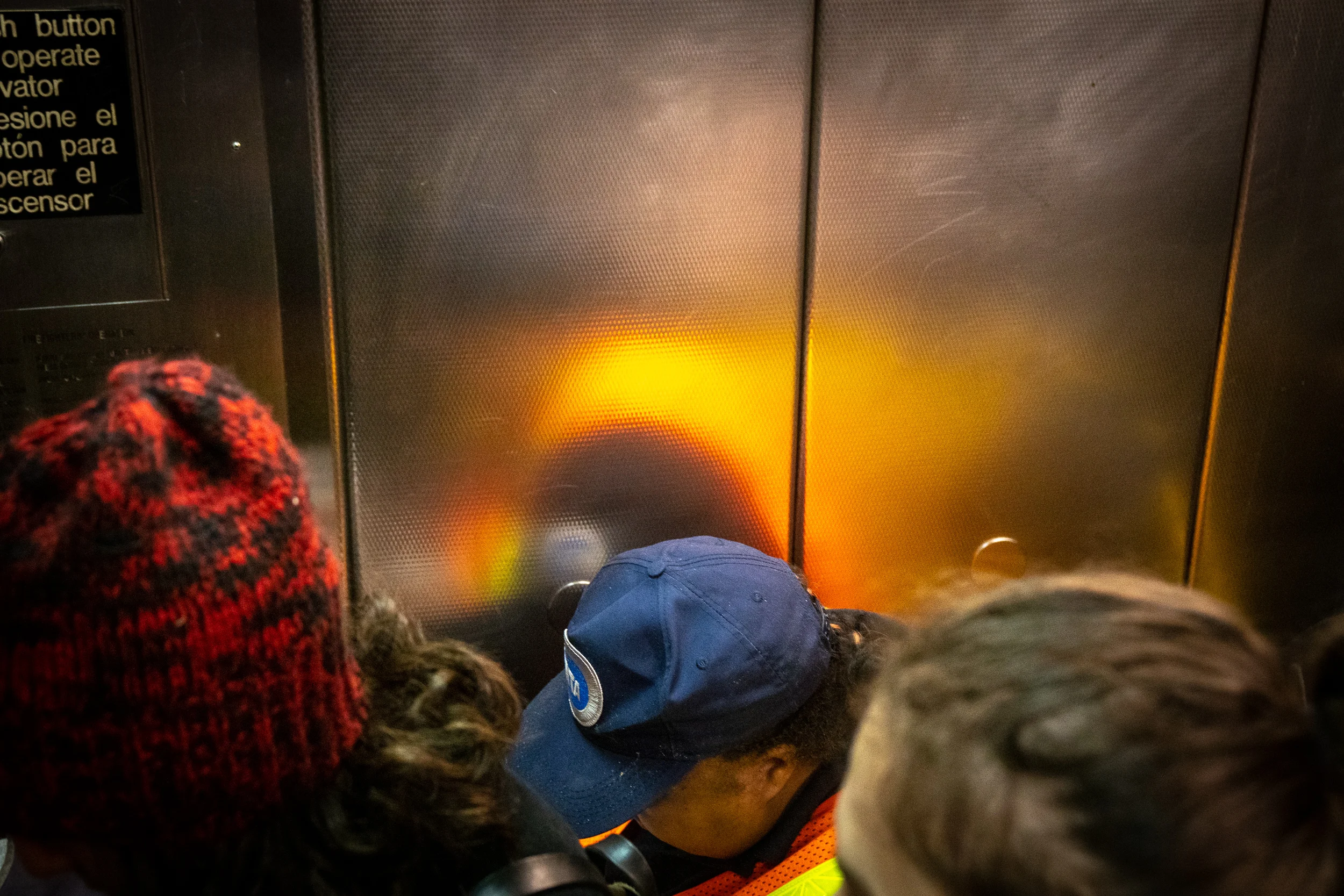 Fifteen years ago, Williams had two colleagues manning two additional elevators of the total four at 181st Street. Now she is alone here and the other three elevators are unmanned. She thinks that having someone manning an elevator is important. “There’s still people that are afraid that they’ll get stuck and then they’re alone,” Williams said. The corrugated stainless steel covering the elevator’s innards reflected her brightly colored safety vest.